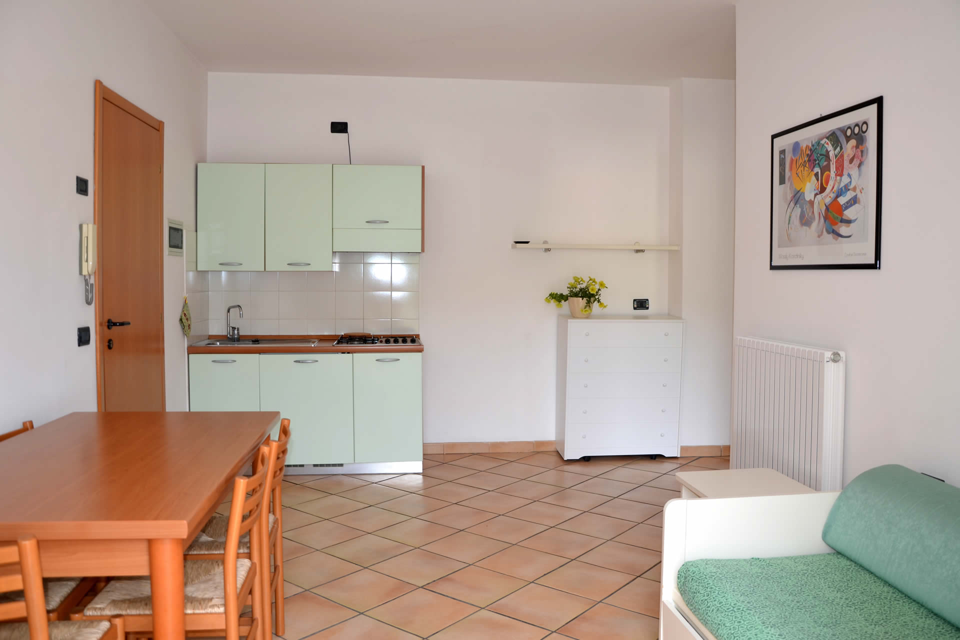 Appartement met slaapkamer, woonkamer met volledig uitgeruste kookhoek, uittrekbare slaapbank en een extra eenpersoons bed, badkamer met douche.